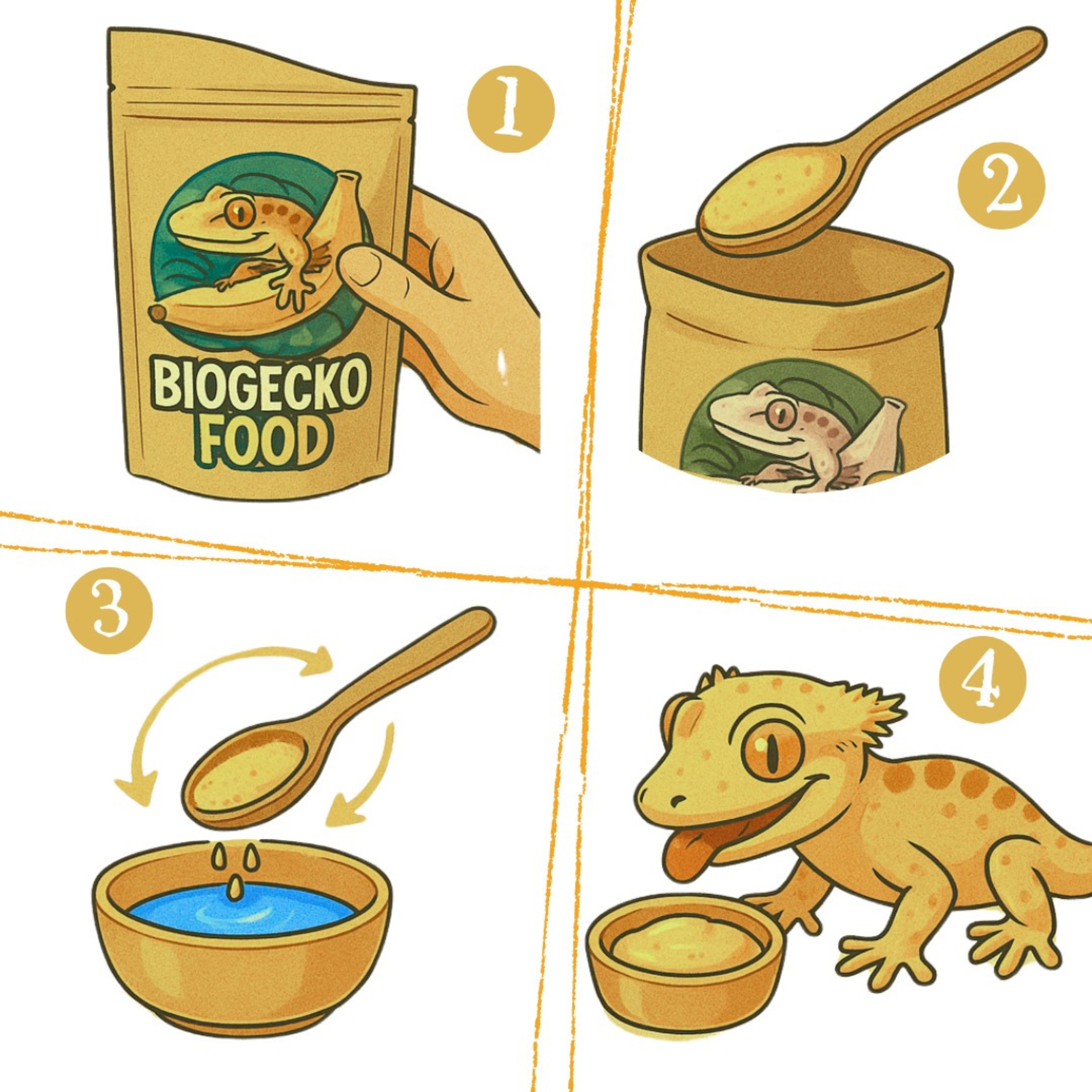 Wymieszaj proszek z wodą w proporcji 1:2 (np. 1 łyżeczka proszku + 2 łyżeczki wody). Mieszaj do uzyskania jednolitej konsystencji jogurtu. Jeśli konsystencja jest zbyt wodnista – dodaj więcej proszku, jeśli zbyt gęsta – dodaj odrobinę wody i wymieszaj ponownie. Możesz przygotować większą ilość pokarmu na zapas i przechowywać w lodówce do 2 dni. Podawaj w miseczce lub na łyżeczce. Pokarm zachowuje odpowiednią strukturę i świeżość nawet przez 12 godzin. Jeśli Twoja jaszczurka nie jest przyzwyczajona do pokarmu w postaci papki – dla zachęty nałóż odrobinę na pyszczek. Twój pupil obliże się i pozna nowy, wyjątkowy smak ulubionego pokarmu BioGecko Food!